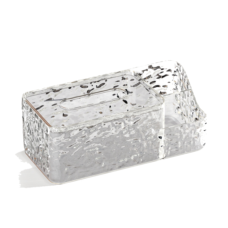 This tissue box features built-in compartments and a smooth, rounded surface free of burrs. Its glacier-textured design exudes a premium feel. The raised, smooth bottom is scratch-resistant and durable, ensuring it won’t damage your tabletop.