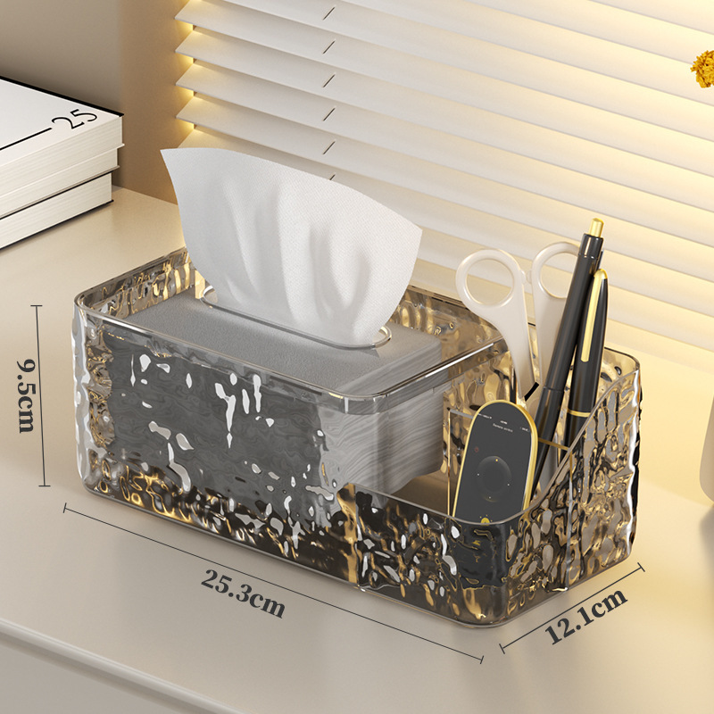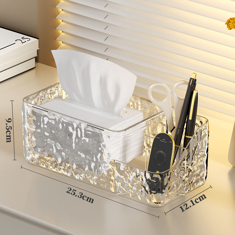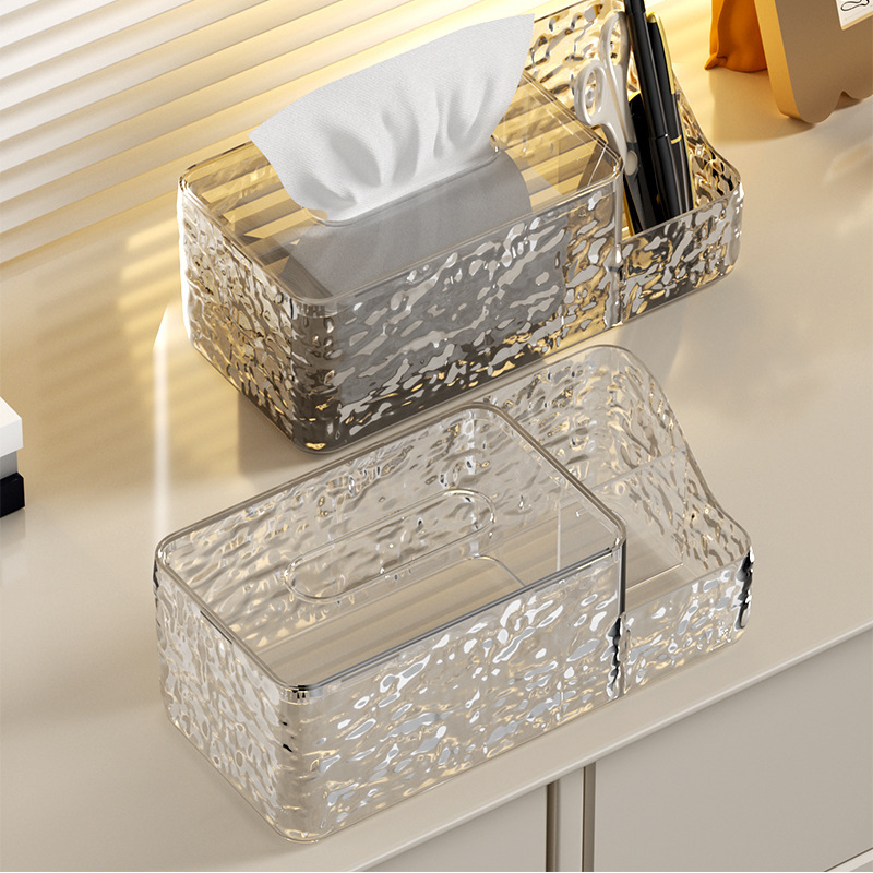 This tissue box features built-in compartments and a smooth, rounded surface free of burrs. Its glacier-textured design exudes a premium feel. The raised, smooth bottom is scratch-resistant and durable, ensuring it won’t damage your tabletop.
