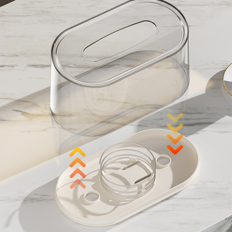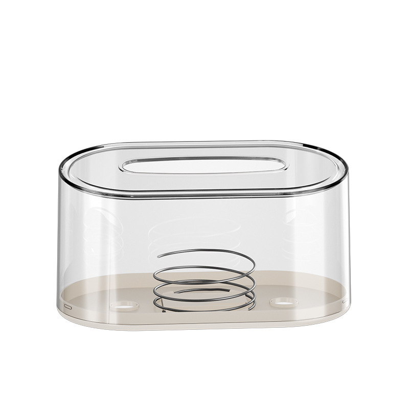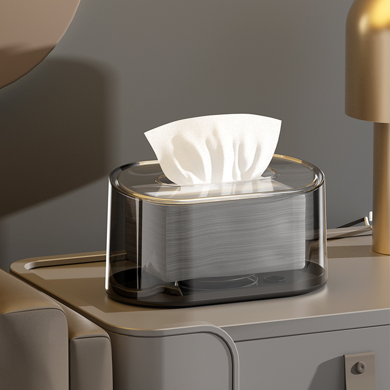 A spring-loaded, automatically rising tissue box, available in transparent and translucent gray colors.